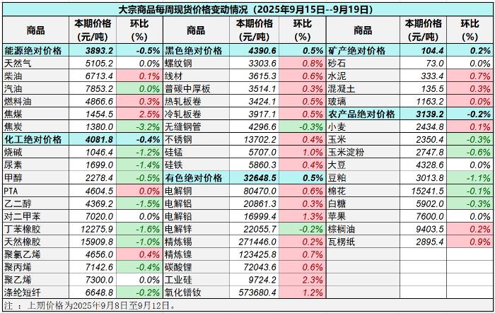 据中国物流与采购联合会对全国50种重要大宗商品市场价格调查显示,本期价格(2025年9月15日至9月19日)与上期价格相比,27种(占比54%)大宗